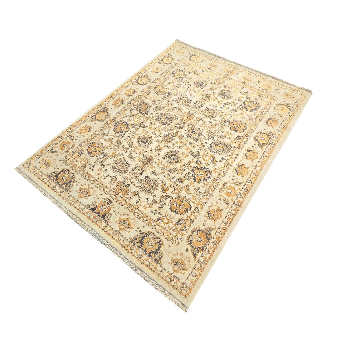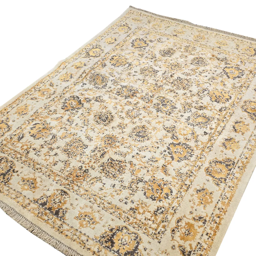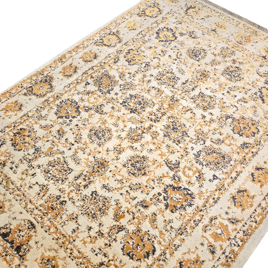 فرش دستبافت پشمی با ترکیب رنگ کرم و طلایی ملایم و رگه های مشکی،انتخابی گرم و متعادل برای نشیمن و فضاهای نیمه رسمی.طراحی نئوکلاسیک با جزئیات ظریف، بدون شلوغی بصری.