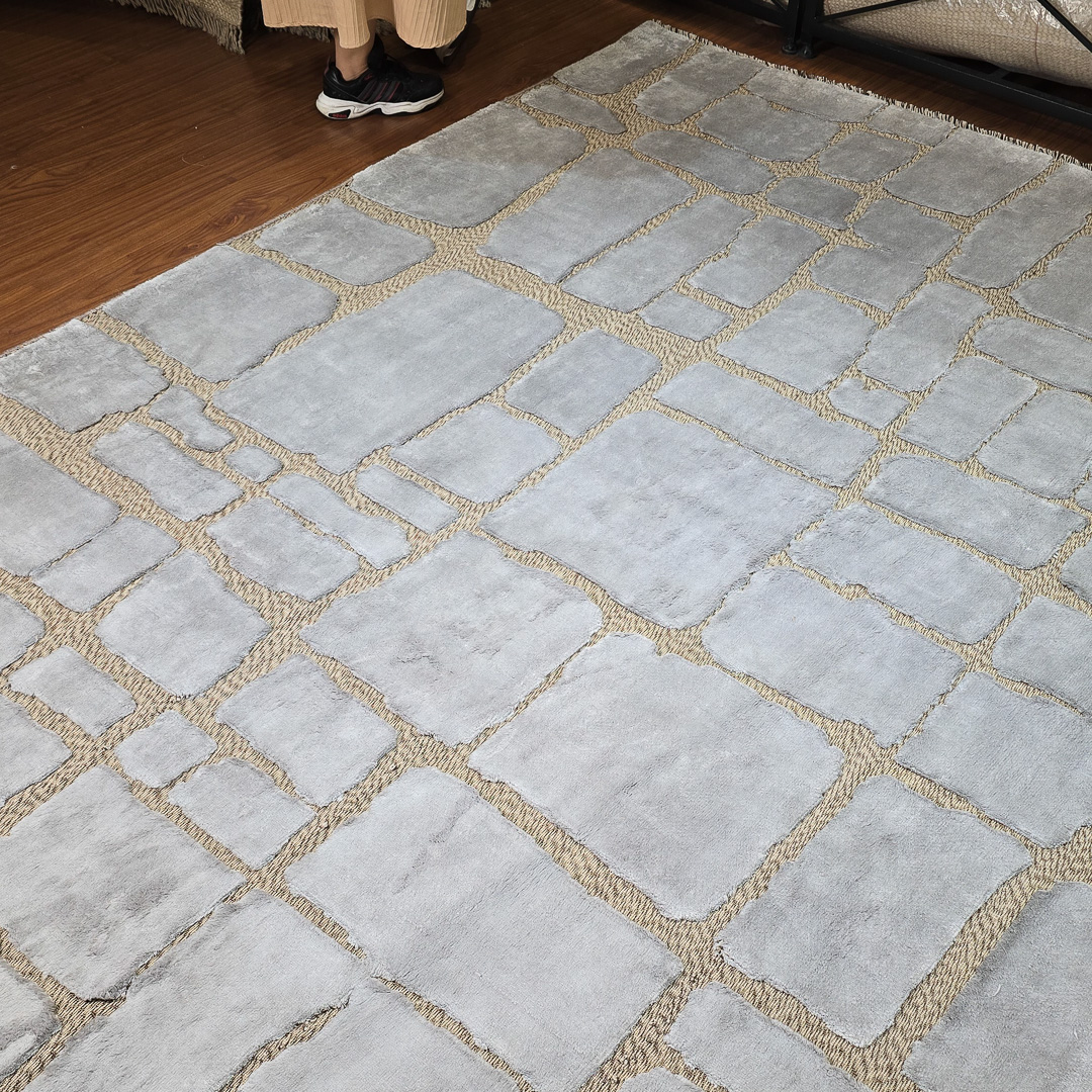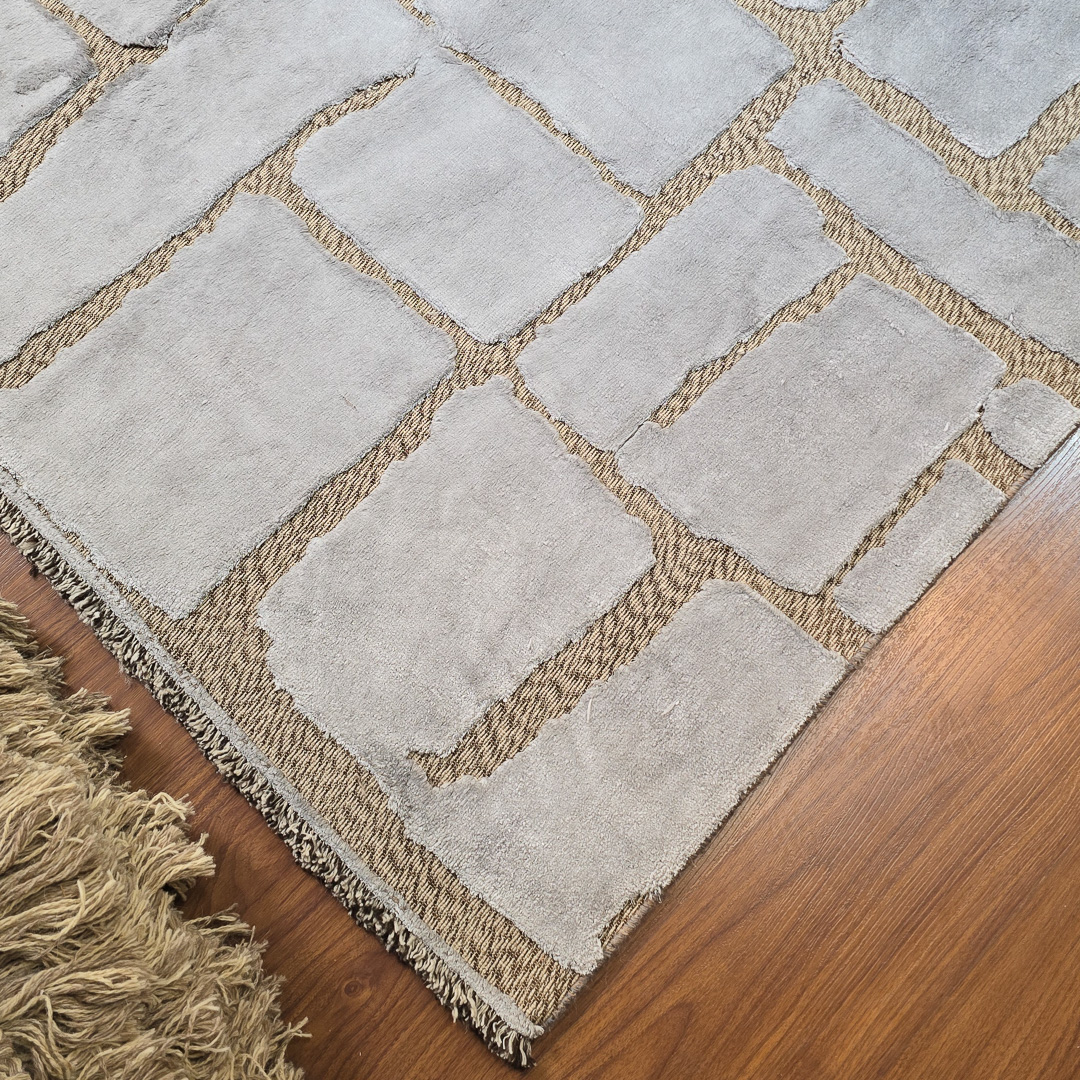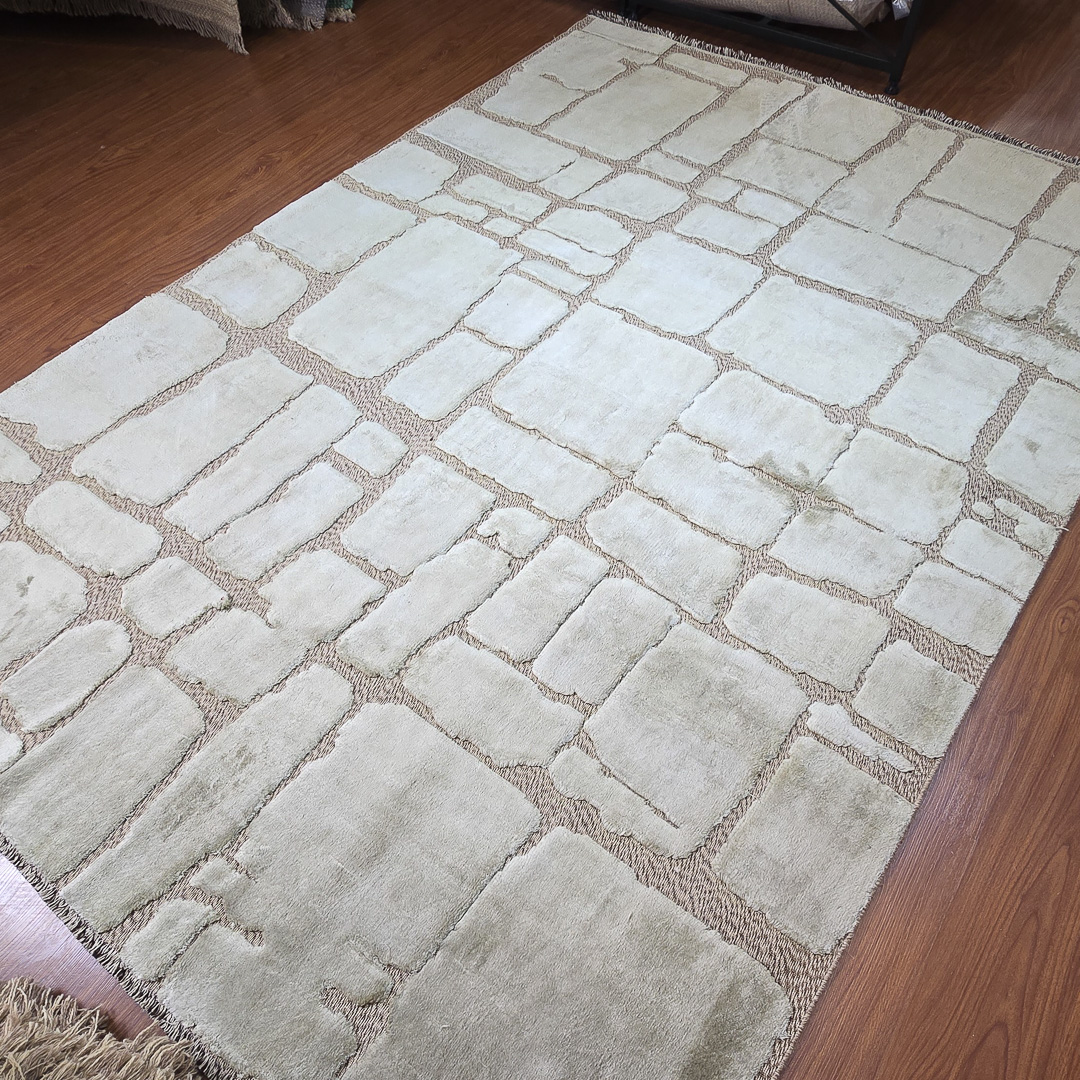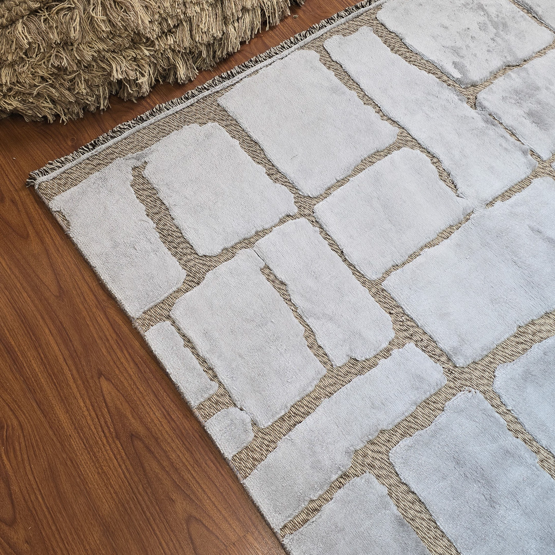 ترکیب پشم و ابریشم به شکل سخره سنگ های استون هنج این فرش به صورت بافت گلیم و فرش بافته شده که این امر باعث شده این فرش بافت برجسته داشته باشه و از زیبایی بسیار زیادی برخوردار باشه.