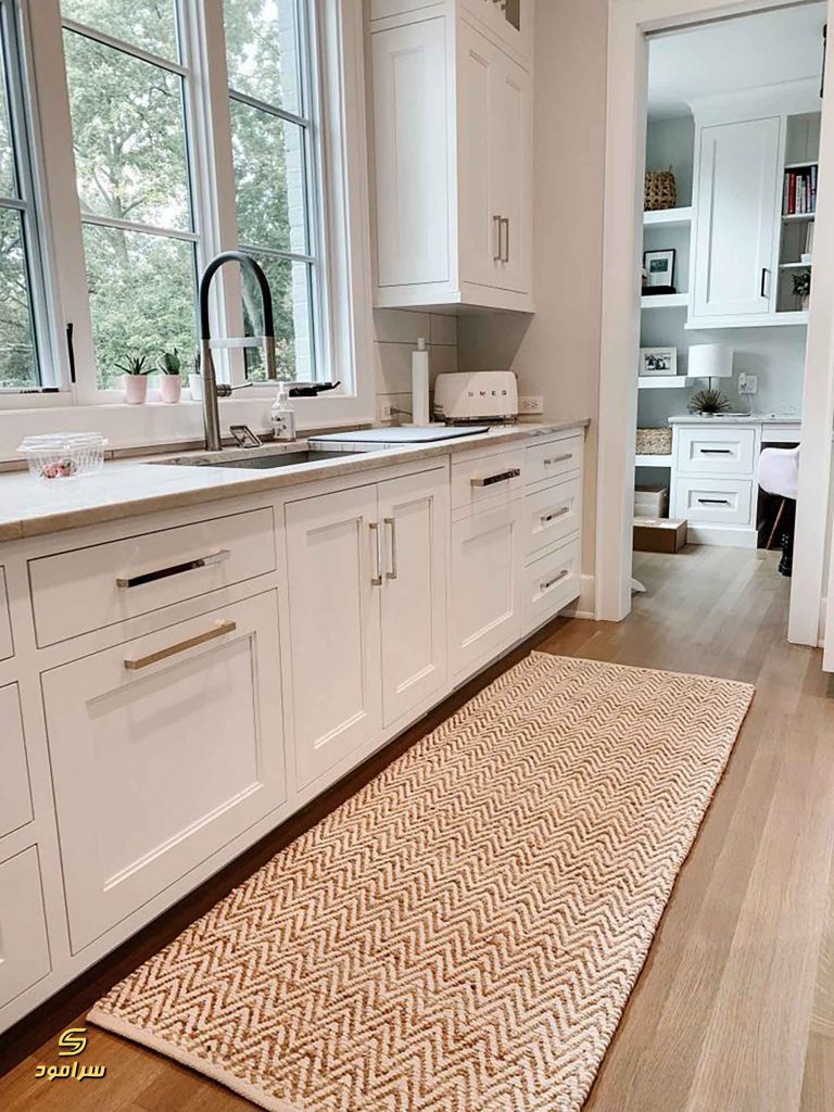 جلوی سینک و اجاق گاز (رانر یا فرش باریک): اگر راهرویی باریک دارید، یک رانر (Runner) با طول مناسب (مثلاً ۱ تا ۳ متر) بهترین کارایی را دارد. باید به اندازهای پهن باشد که زیر پای شما قرار بگیرد اما مانع باز و بسته شدن کابینتها یا درها نشود.