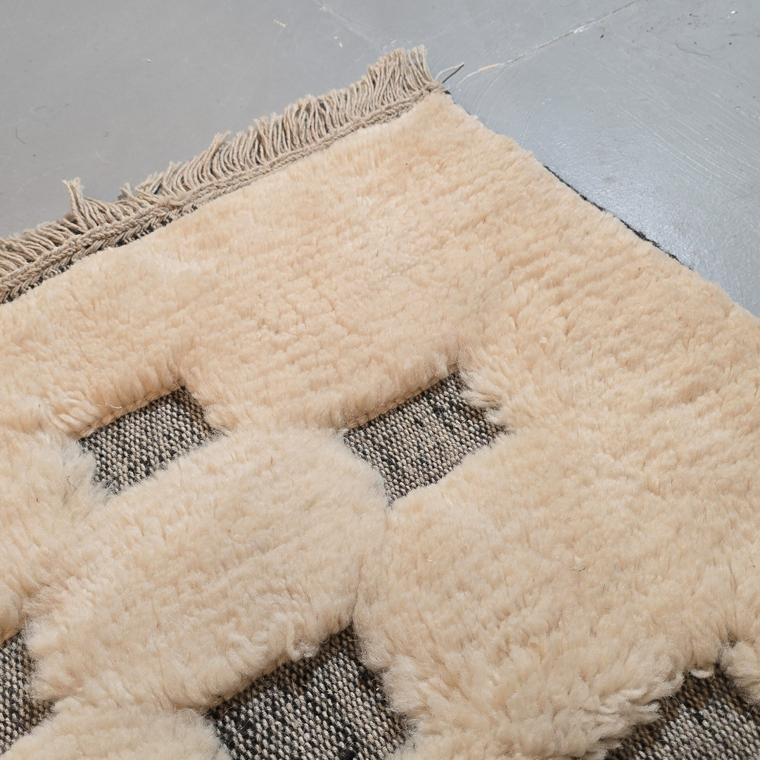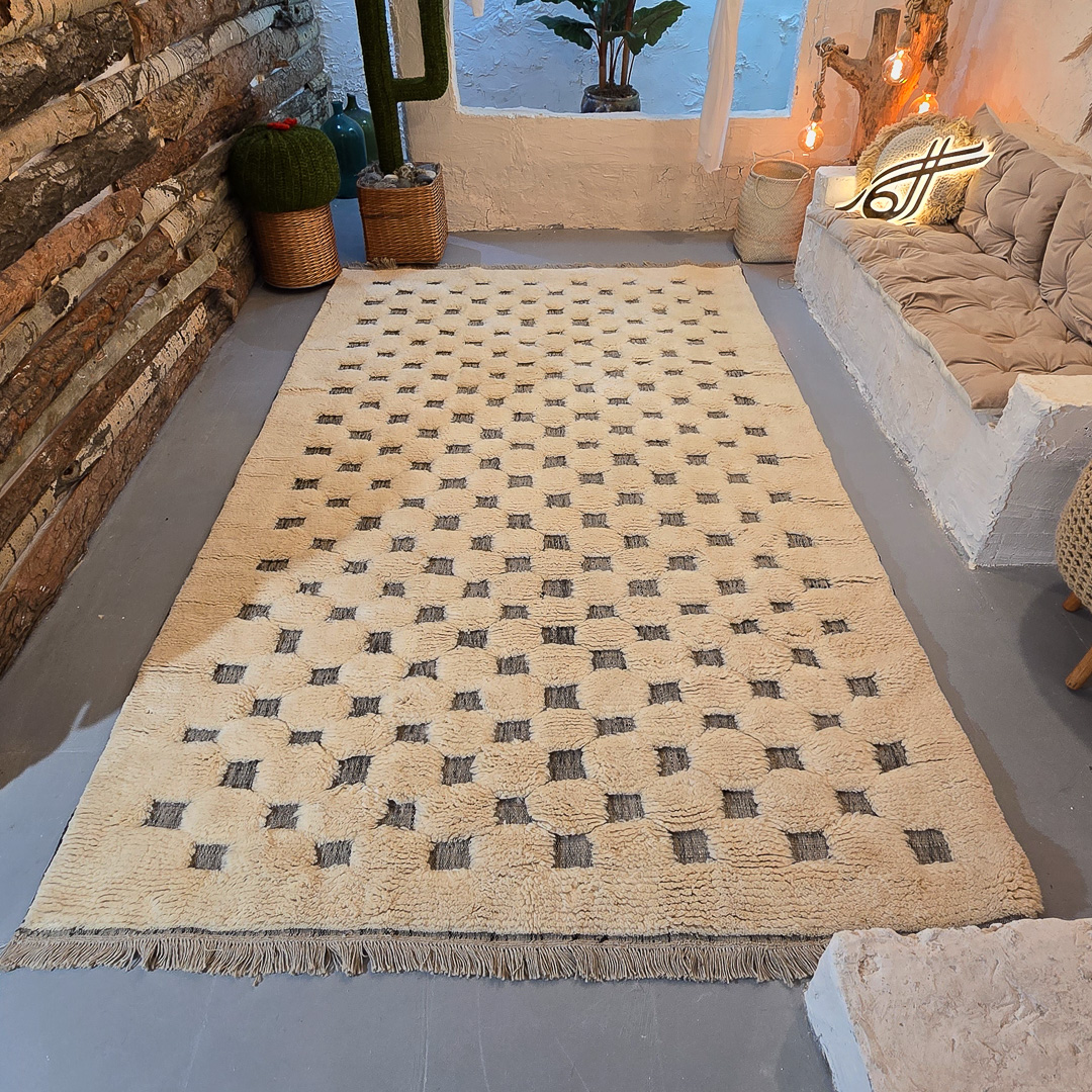 ایده گرفته شده از بازی زیبای شطرنج فرش کوئینز گمبیت به شکل سفید با زمینه طوسی بافته شده و این امر باعث شده نتیجه کار یک فرش بسیار زیبای چهارخونه باشه. ضخامت این فرش در حدود دو سانتی متر هست و از بافت بسیار بی نظیری برخورداره.